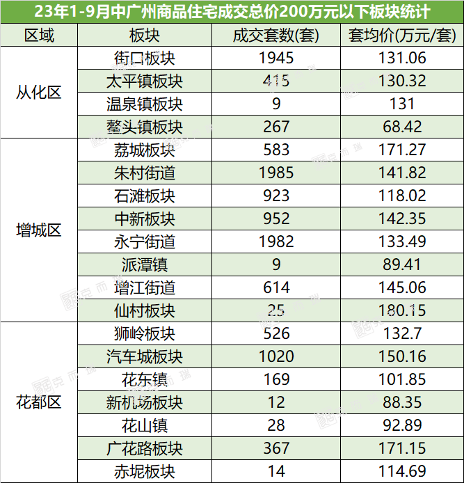 据克而瑞统计到,今年1-9月中,全市总价低于200万的的板块一共有19个,主要集中在外围区,包含从化全域、部分花都、增城板块。