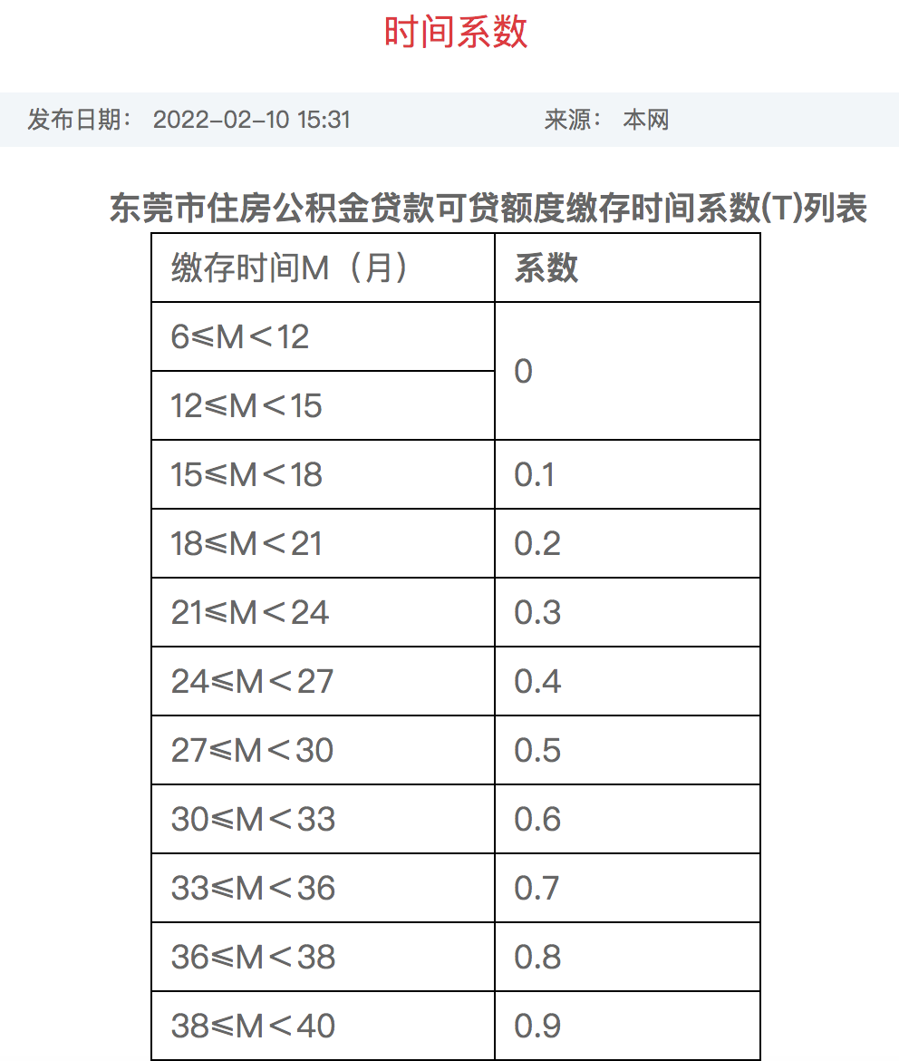 按照东莞市政府此前公布的公式,职工个人公积金贷款可贷额度Y=个人公积金账户余额B×(缴存时间系数T +收入调节系数I)×流动性调节系数L。
