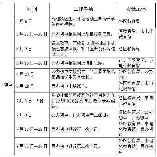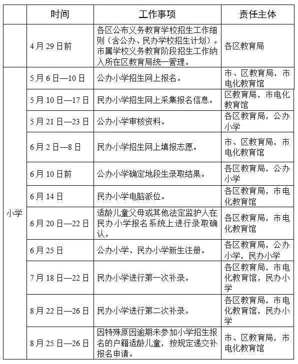 根据安排,4月29日前各区公布义务教育学校招生工作细则(含公办、民办学校招生计划)。市属学校义务教育阶段招生工作纳各区教育局。