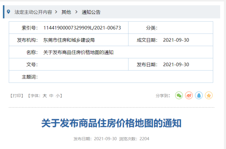 9月30日,东莞市住建局发布了《关于发布商品住房价格地图的通知》。