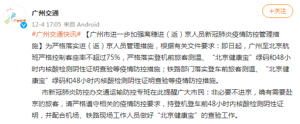 据通报,为严格落实进(返)京人员管理措施,根据有关文件要求: 即日起,广州至北京航班严格控制客座率不超过75%,严格落实登机前旅客测温、“北京健康宝”绿码和48小时内核酸检测阴性证明查验等疫情防控措施;铁路部门落实登车前旅客测温、“北京健康宝”绿码和48小时内核酸检测阴性证明查验等疫情防控措施。