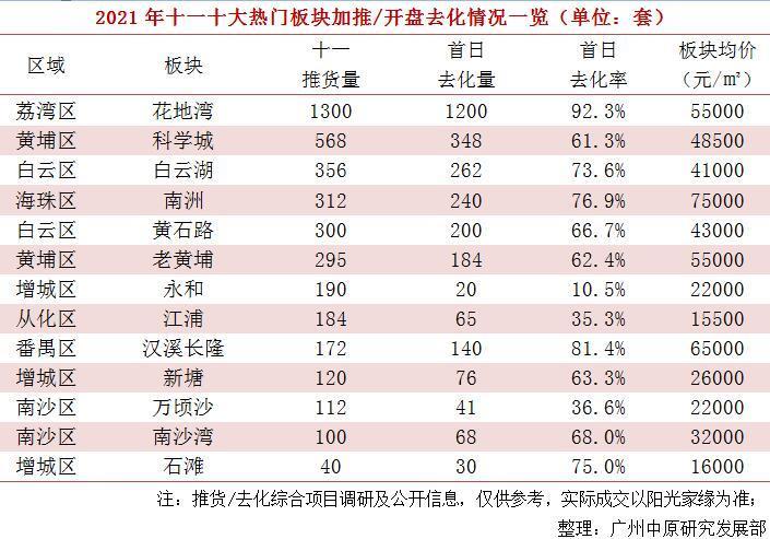 在广州中原研究发展部的统计中,荔湾花地湾板块去化率较高,达约92%,番禺汉溪长隆、海珠南洲、白云的白云湖等板块新货首日去化率都超过70%;但南沙的万顷沙、增城的永和、从化的江浦等板块的去化率则在10%-30%幅度。