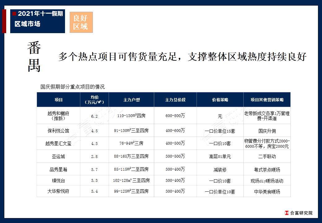 据了解,在国庆期间开放样板房并接受咨询登记的楼盘将会在国庆后正式推售新货,这其中有多个热度较高的新盘和上半年的畅销盘,如荔湾的广州滨江上都、天河的珠江花城和天河壹品、海珠的中旅天宸府、黄埔的万科城市之光和升龙学府上城、番禺的龙湖金地天峯等盘,它们各自的货量都不小,从目前咨询登记的情况看,只要其开盘价出价合理,这些项目开盘都有望获得较好的成交。