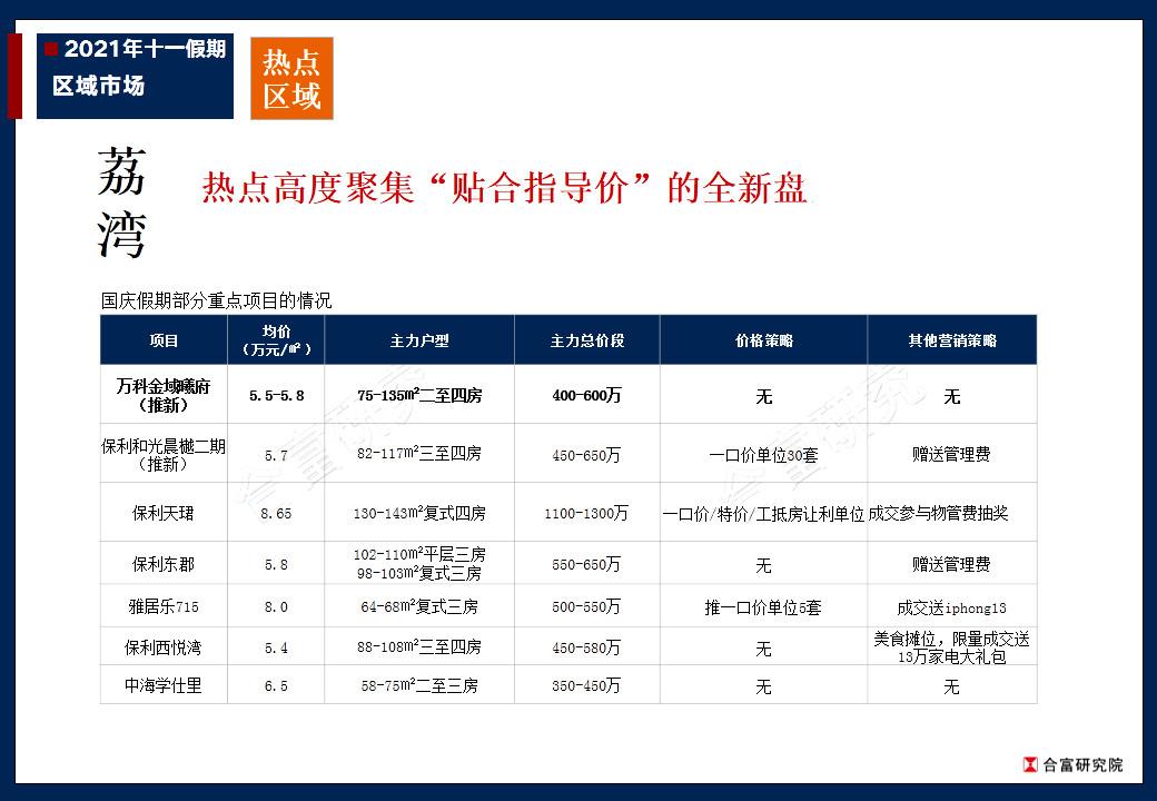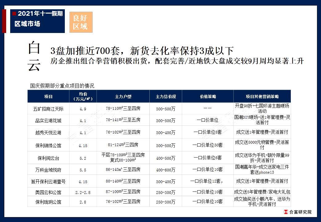 合富研究院数据显示,中心及近郊片区的新货以“贴合指导价”的价格入市获得了较好成交,该片区整体售价环比相对平稳,荔湾、白云两区的小部分楼盘让利促销,幅度约5%,而番禺部分板块个别去化缓慢的项目推售一口价单位,让利幅度为5%-10%。