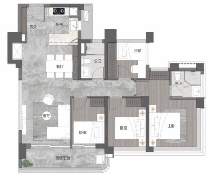 少承重墙设计也为未来生活留出更多想象。空间从一房到四房灵活可变,使住宅更具“成长性”,不仅能从容应对家庭结构与生活方式的变化,也使其在市场中价值韧性。