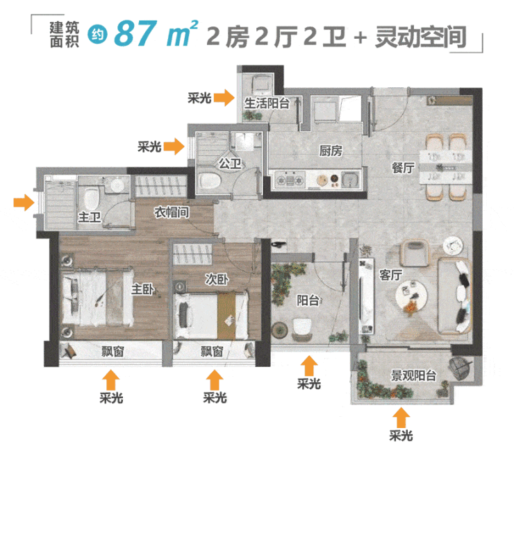不到90平的面积做到11米南向四开间,厅房全部都能享受最大化的景观与通透性,确实不多见。景观阳台约270°视野,约3万方中央园林就在眼下铺开,邀景入室,清风徐来。+1房都比市面上更大,放下1.5米床、床头柜以及衣柜都没问题,灵动改造的发挥空间也更大。约87平的总价,给到业主约100平的居住体验感,这是新世界星辉致敬奋斗者最大的诚意。