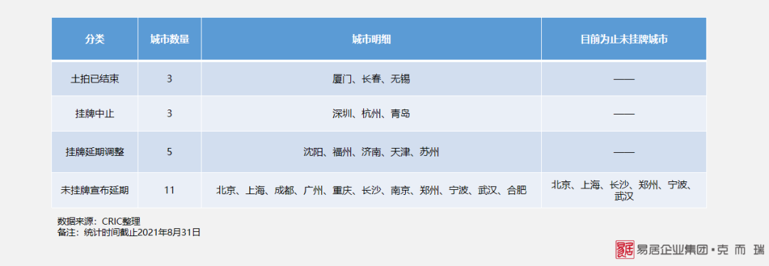 自然资源部2021年8月10日闭门会议对土拍规则提出要求后,19个城市相继中止或延期第二批土地挂牌,其中深圳、杭州、青岛中止挂牌,沈阳、福州、济南、天津、苏州等5个已挂牌城市延长挂牌截止时间,并调整土拍条件;其他11个未挂牌直接宣布延期的城市中,截止8月底仅5个城市第二批土地正式挂牌,首轮供地地价涨幅较大的城市目前二批供应暂缓。