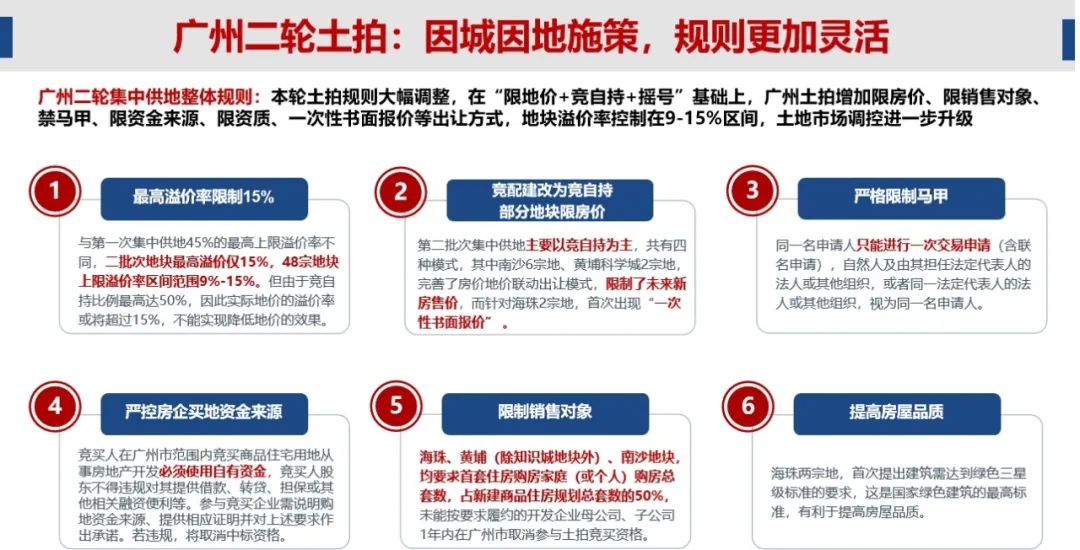 对比其他城市第二批土拍规则,广州更注重因城施策、因地施策,并未执行一刀切的土拍规则,针对部分热门区域(如海珠、南沙、黄埔等)设定“限房价、限销售对象以及实行终次报价”的拍卖规则。