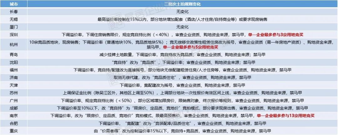 根据排名前列轮集中供地成交情况,各城市均对第二轮土拍规则进行相应调整,其中大部分城市均下调溢价率至15%以下,以此降低企业恶性竞争及拿地成本;