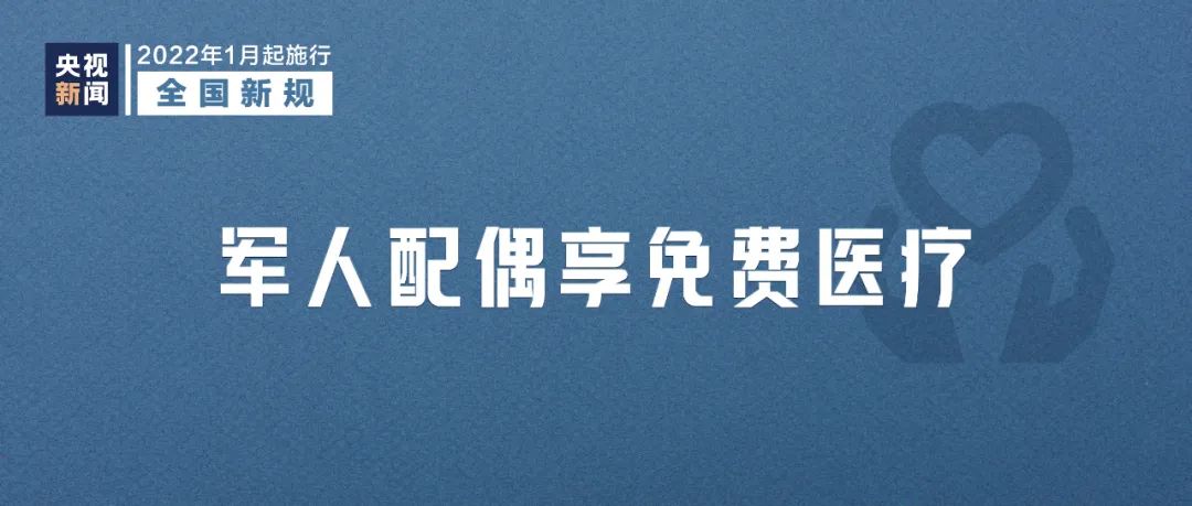 《军人及军队相关人员医疗待遇保障暂行规定》2022年1月1日施行。明确军人配偶免费医疗、军官军士父母和配偶父母优惠医疗,继续实行军人、军人未成年子女免费医疗。