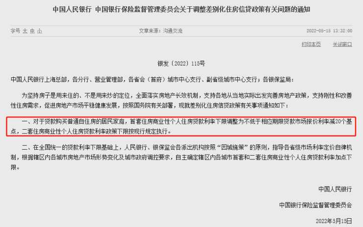 根据中国人民银行、中国银行保险监督管理委员会5月15日发布的《关于调整差别化住房信贷政策有关问题的通知》,“首套住房商业性个人住房贷款利率下限调整为,不低于相应期限贷款市场报价利率减20个基点。”