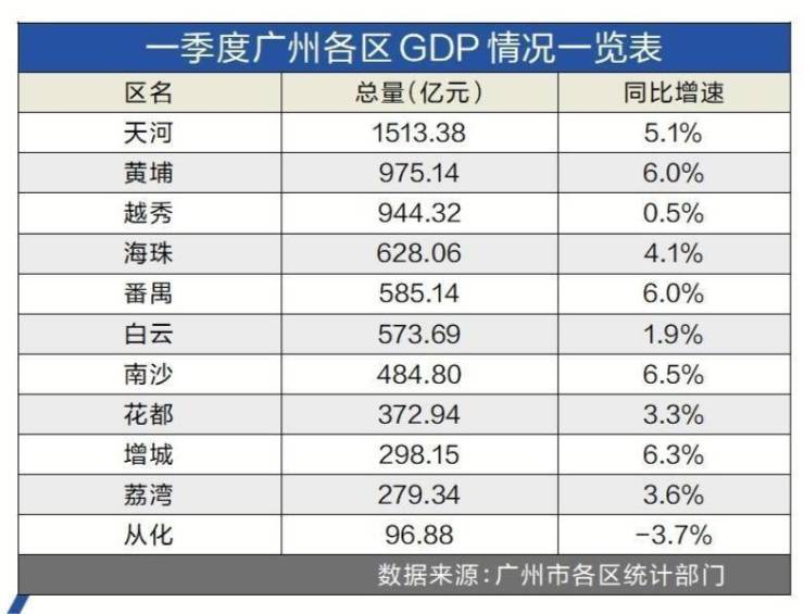 羊城晚报记者梳理广州各区情况了解到,从GDP总量来看,天河(1513.38亿元)、黄埔(975.14亿元)、越秀(944.32亿元)依旧稳居全市“排名前列方阵”。