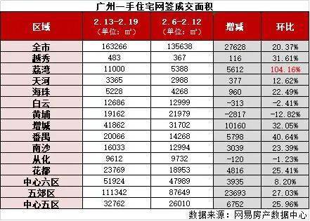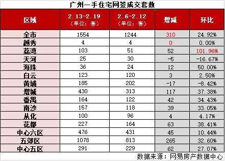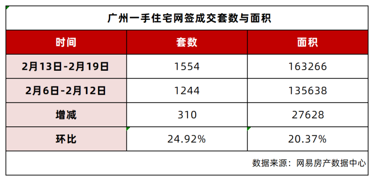 据网易房产数据中心监控阳光家缘数据显示,上周(2月13日-2月19日)广州新房共成交1554套,环比上升24.92%,成交面积为163266㎡,环比上升20.37%。
