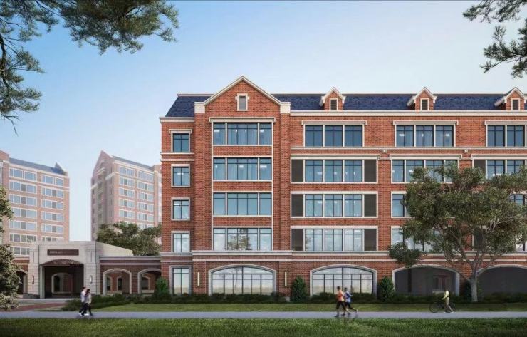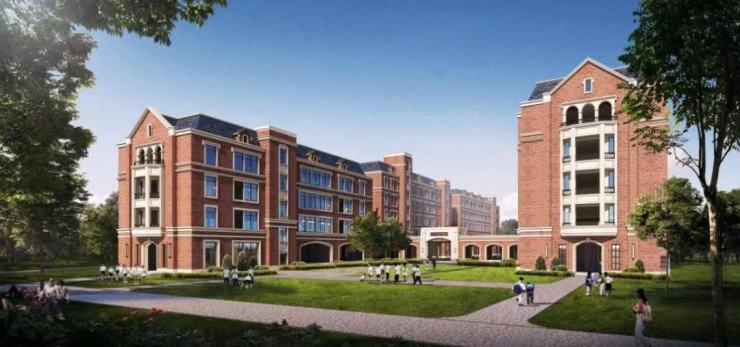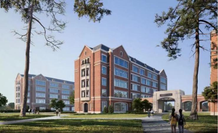 而建筑材料选用红砖、石材线脚和白色窗框搭配使用,配合精致典雅的细部处理和装饰纹样,本体色彩中浓重的红褐色,演绎了富足雅致的生活情调,点缀的蓝灰色,演绎了独具浪漫的英式风情,整体塑造百年老校的气质和神韵。