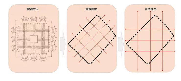 学校规划营造采用中国古典的营造手法,将这块从幼儿园到高中十多年生活、学习的地块比作一座小城,抽象出古典营造手法中的三横三纵,划分出多块不同功能的区域。同时,考虑到学校的采光,教学建筑宜南北向布置,且运动场地对角度也有规定,设计中将区域划分转正后再进行功能布局。