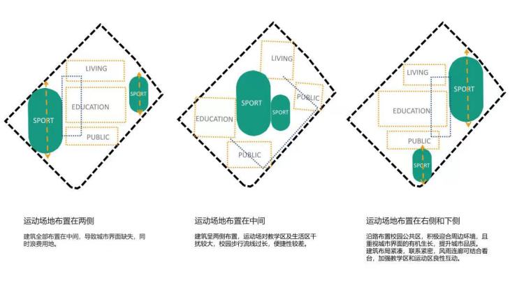 而在运动场地的布置,设计师也进行了多方位的对比分析: