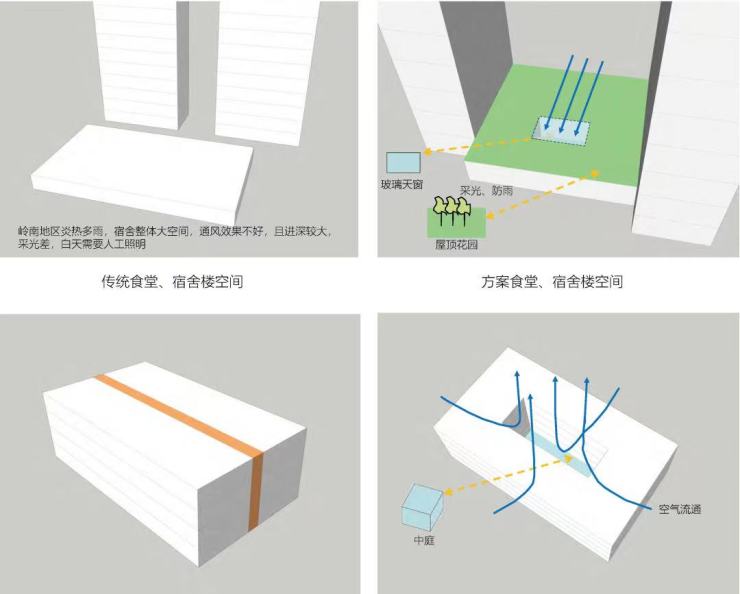 食堂、艺术综合楼的设计摒弃了传统的空间模式,在其内部插入中庭空间,增加室内外景观的渗透性与互动性。此外,中庭可以增加空气的流动性,调节空间的微气候,以适应当地炎热潮湿的气候。