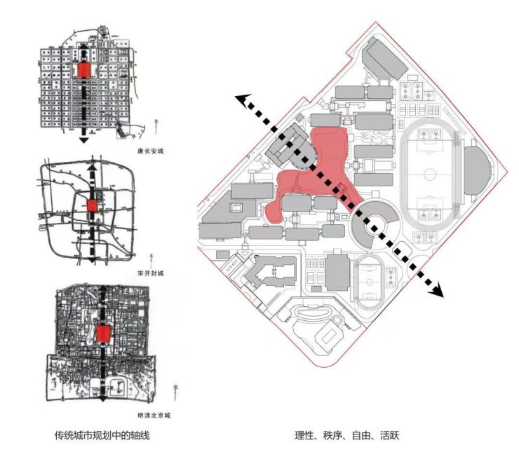 结合场地的形状引入古代城市规划中常见的主轴线,统领各功能区。在技术层面上,为合理安排功能复杂的建筑群提供了便利;在空间层面上,创造出贯穿用地的景观及步行带;在心理层面上,为学生们提供足够的心理依靠和安全感,使得整体呈现出人工与自然互补、自由与秩序结合的圆融、和谐状态。