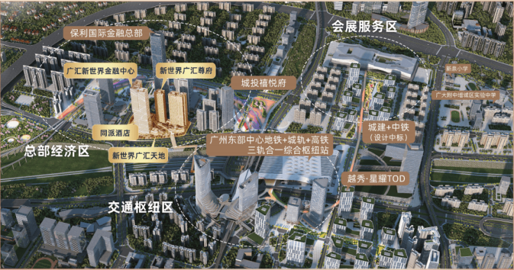 作为广州东部中心唯一的国际化社区,广汇新世界综合体复刻“东塔+瑰丽+广粤天地+广粤尊府”设计理念,融合广州东部中心超甲级写字楼-广汇新世界金融中心、广州东部中心高端消费目的地-新世界广汇天地、广州东部中心首家潮流酒店同派酒店、以及尊府系品质住宅新世界广汇尊府于一体,打造“珠江新城式”顶奢生活圈,不断满足着高净值人群的商务、消费、社交、休闲等生活需求。