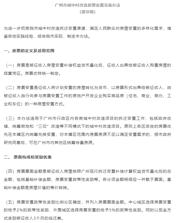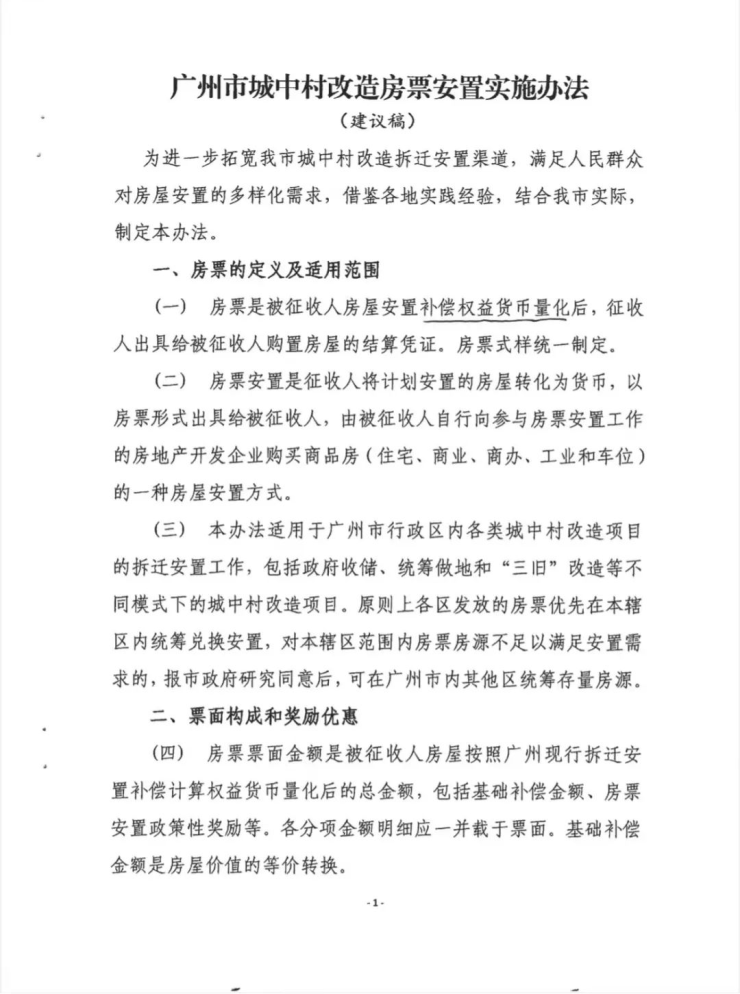 这几天,一份网传文件——《广州市城中村改造房票安置实施办法》的建议稿在社群、朋友圈疯狂刷屏。