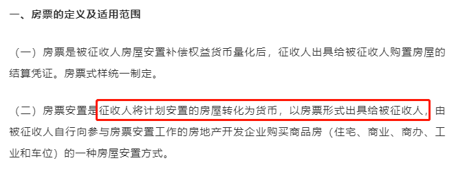 征收人将计划安置的房屋转化为货币后,这笔钱会以房票形式出具给村民;而村民可以凭借着这张凭证去买商品房、公寓、商铺、车位等。