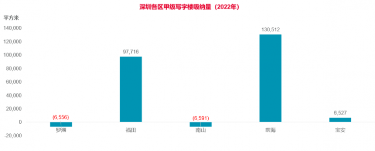 作为产业发展和商务活动的载体,前海写字楼的落成为企业筑巢,随着片区交通及商务配套的大幅改善,加上落户的政策利好、租赁成本相对较低等优势持续吸引企业新入驻或搬迁至此,商务规模效应不断加强。2022年全年前海甲级写字楼净吸纳量录得13.1万平方米,占全市吸纳量58.9%,比重较去年上升14个百分点,是全市甲级写字楼办公需求的吸纳的主力区域。