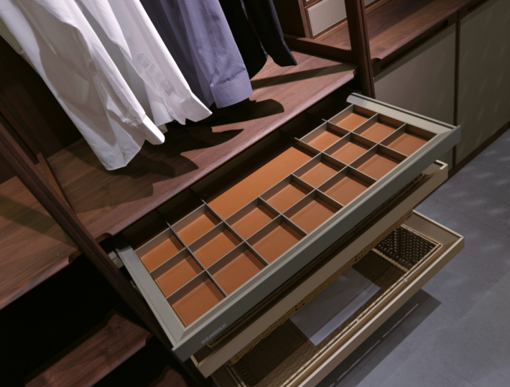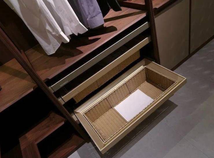 金属拉手与挂篮的点缀、爱马仕橙格型抽屉盒、梳妆台内嵌式胡桃木收纳盒等,恰到好处的细节处理,加上收纳有序的设计理念加持,无不彰显着设计师在设计中的思考与智慧,彰显“住而有品”的格调。