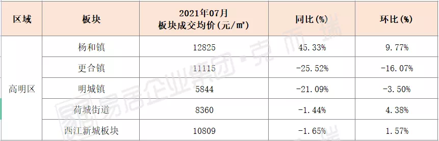 高明区2021年7月份,高明区的住宅成交量主要来自荷城街道板块和西江新城板块,而杨和镇和更合镇板块一手住宅成交均价较高,主要是由于板块内别墅项目的成交价拉高平均值。