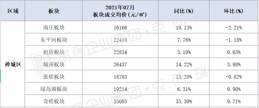 禅城区作为佛山中心区的禅城区,该区七大板块一手住宅均价涨势平稳。其中奇槎板块7月份均价达35065元/㎡,同比上涨35.39%,环比上涨9.71%。要注意的是,奇槎板块均价同比涨幅较高,主要是由于今年7月份板块内网签成交了7套5.3万/㎡别墅项目,拉高了单月平均值。