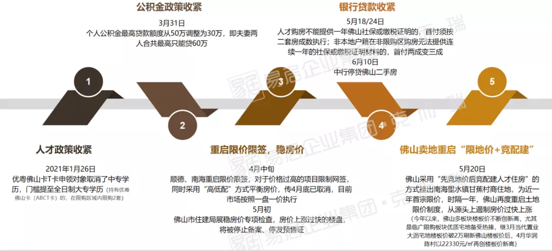 如此活跃且潜力无限的一座城,除了开发商,其市场亦自然受到广大购房置业者的关注;而楼市光环之下必然存在政府的调控大局。克而瑞数据显示,进入2021年佛山市调控出手频频,在上半年佛山整体调控已然趋紧,一季度率先收紧人才政策、人才购房和收紧公积金贷款政策,然后在二季度迅速提升“双非”客户首付门槛,并且一手房源重启限价限签,卖地重启“限地价+竞配建”。