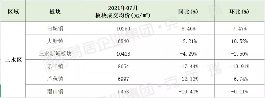 三水区三水区,与高明区同为佛山的房价洼地,片区内板块一手住宅均价在1万一平上下,克而瑞监测到,在7月份仅白坭镇板块一手住宅成交均价同环比上涨。