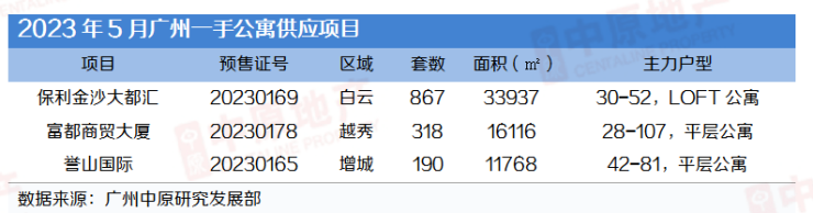 另外,白云区保利金沙大都汇新增供应867套30-52㎡的LOFT公寓,增城区誉山国际供应190套42-81㎡的平层公寓。