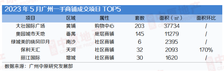 其余上榜项目为散售交易,南沙区绿城美的晓风印月、天河区保利天汇、增城区丽江国际各成交一两千方社区商铺。