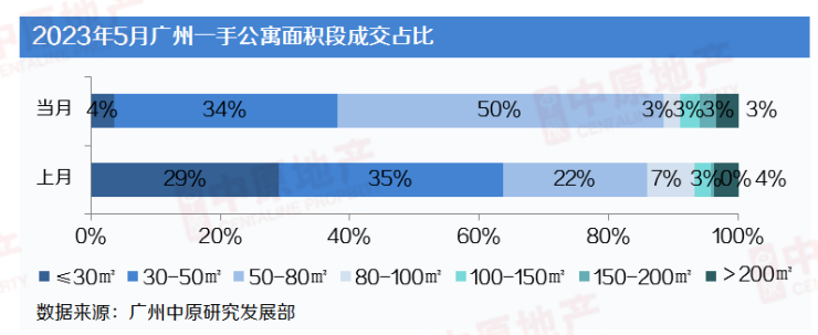 面积段方面,本月30-50㎡、50-80㎡两个主力面积段的占比恢复至34%、50%。