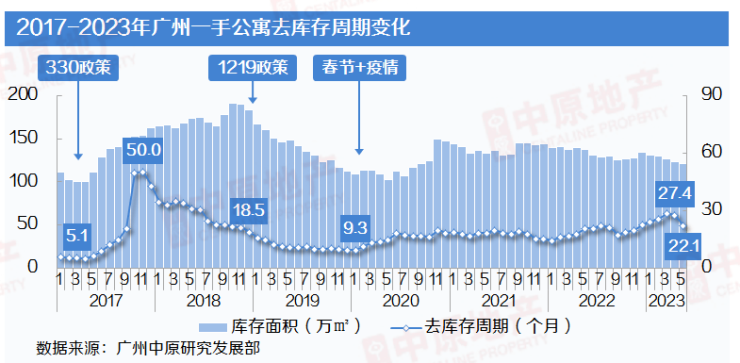 近期市场去化提速,广州公寓库存量持续下降,截至5月末库存量为121万㎡,去库存周期降至22.1个月。