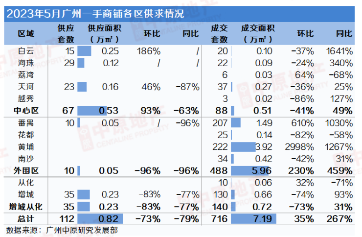5月广州商铺市场供应缩减,仅入市112套0.82万㎡,环比下跌73%。