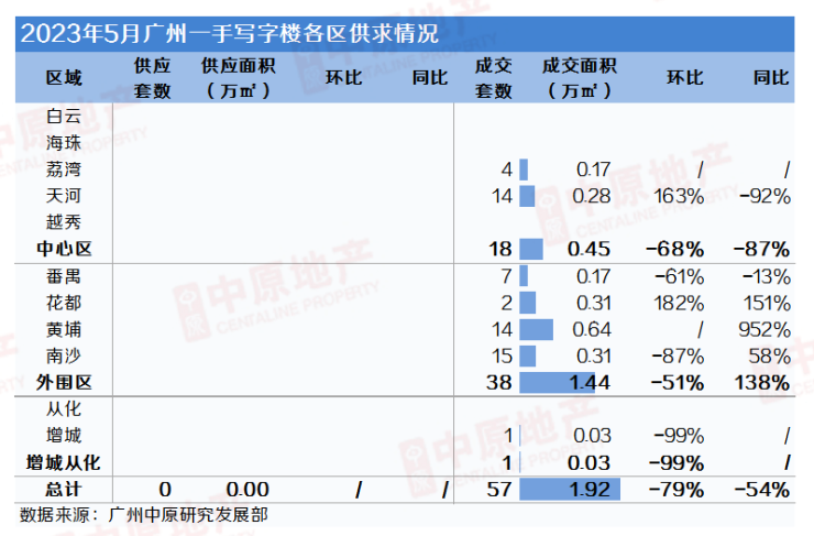 市中心仅天河、荔湾区录得写字楼交易,以金融城、龙溪板块的项目余货销售为主。