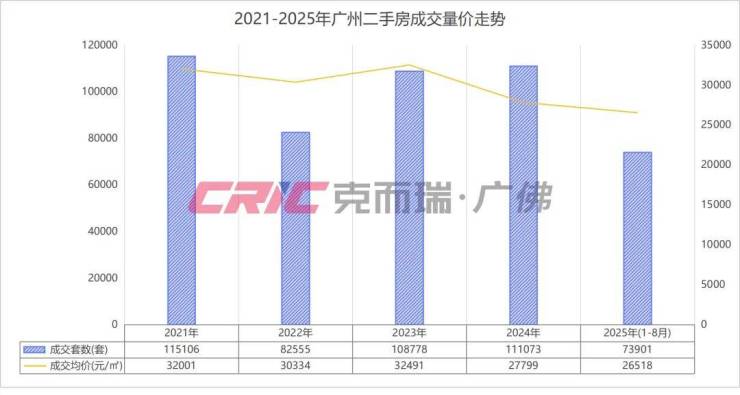 今年1-8月广州二手房成交均价26518元/㎡,较高位时期回落17%。