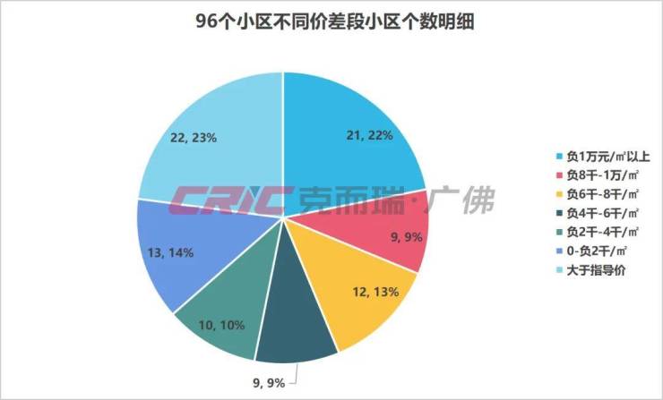 为了研究这些小区价格变化情况,小编用这些小区最新二手房成交均价与指导价对比后发现,96个指导价小区最新成交情况中,超7成的小区成交均价低于指导价,其中价差在1万元/㎡以上的小区有21个,其次是价差低于2000元/㎡的小区有13个。
