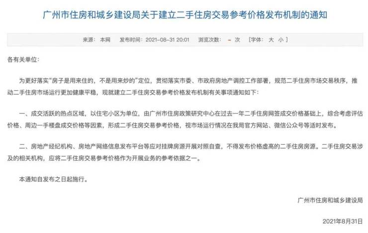 还提到,广州房地产经纪机构、房地产网络信息发布平台等应对挂牌房源开展对照自查,不得发布价格虚高的二手住房房源。二手住房交易涉及的相关机构,应将二手住房交易参考价格作为开展业务的参考依据之一。
