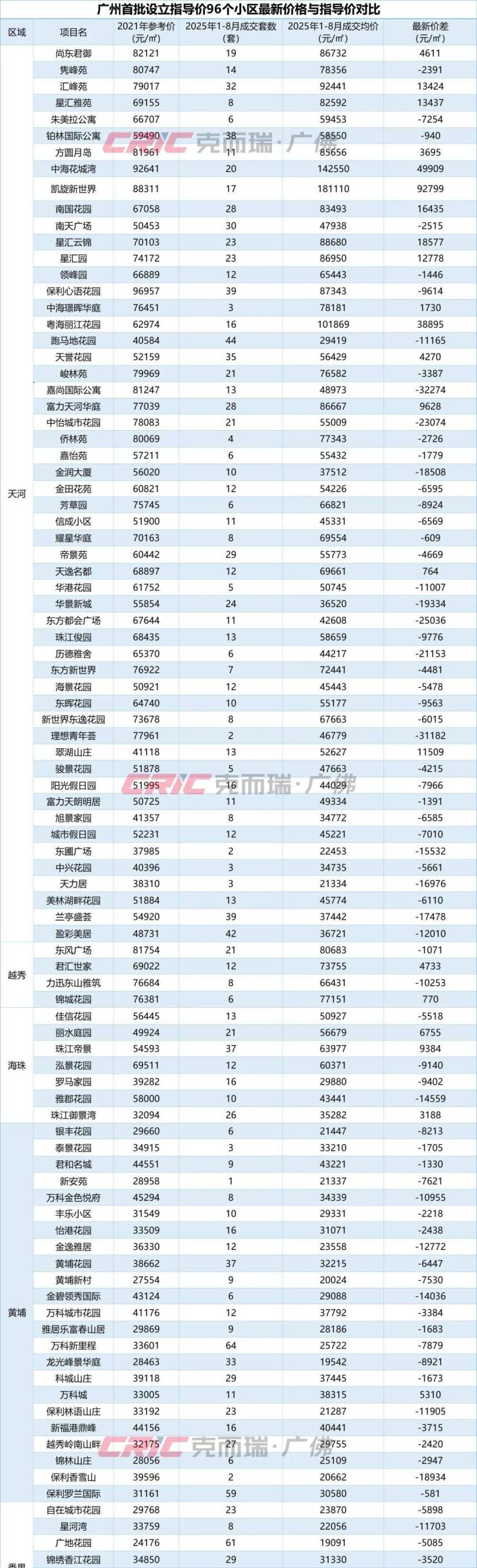 例如凯旋新世界,中海花城湾,其中中海花城湾今年1-8月二手房成交均价142550元/㎡,高于指导价近5万元/㎡。