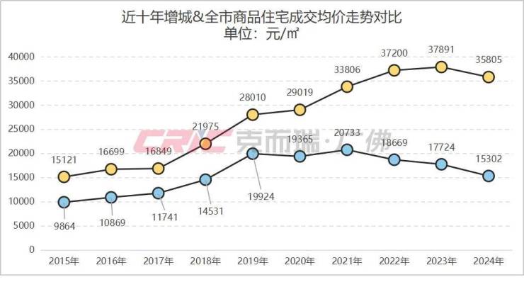从近十年增城商品住宅成交均价走势看,克而瑞数据监测显示,除2021年增城区成交均价迈入“2字头”外,其余年份均在“1字头”徘徊,远低于全市的成交均价。