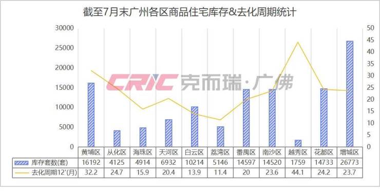 从新房库存上看,克而瑞数据监测显示,增城区商品住宅库存26773套,为全市最高,不过在去化周期上,增城区与南沙区不相上下,低于从化、花都两区。