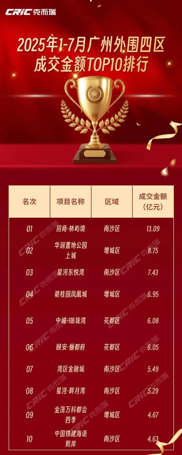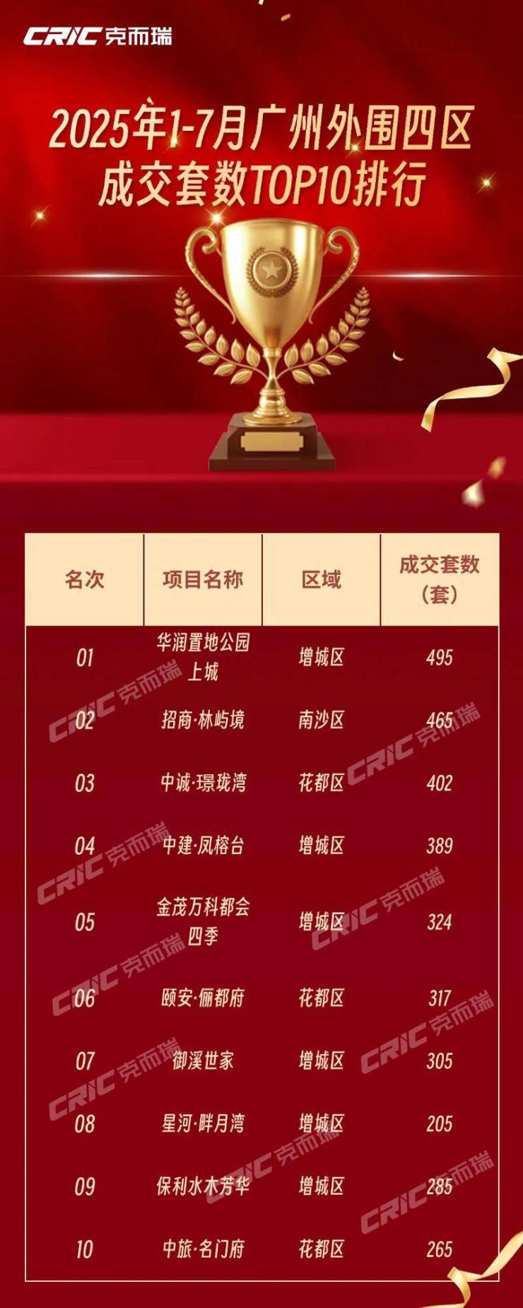 可以看到,在套数榜上,增城区有5个项目上榜,其中华润置地公园上城以495套成交规模、8.75亿元成交金额获得套数榜冠军、金额榜亚军。