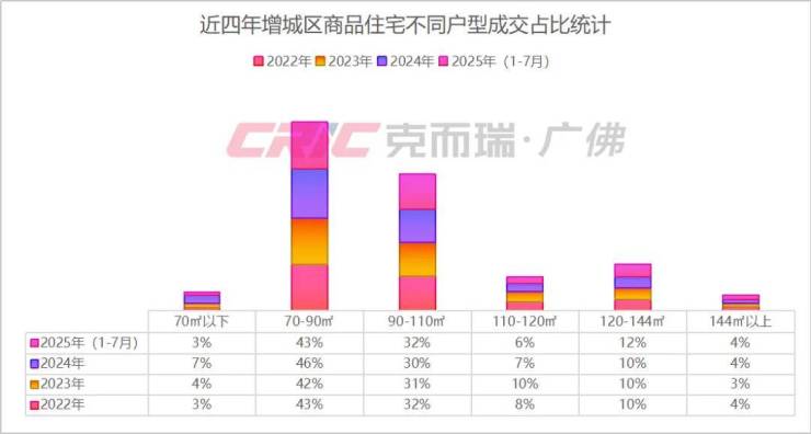 在成交结构上,克而瑞数据监测显示,2025年1-7月增城区一手住宅热销面积段集中在70-90㎡、90-110㎡两大主力面积段,分别成交2952套、2248套,占比依次为43%与32%。