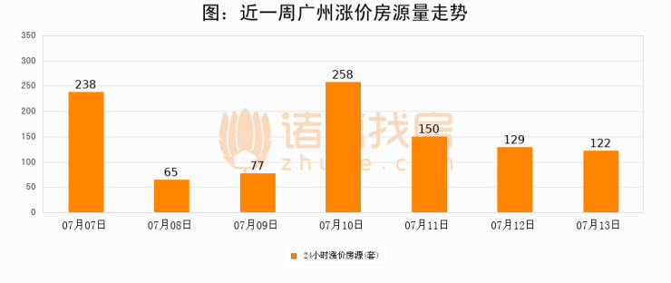 根据诸葛找房数据显示,广州24小时涨价房源量为122套,较07月12日减少7套,环比下降5.4%。与此同时,涨价房源占比小幅回落,对于购房者来说是一个入市窗口期,购房者可抓住时机入市。