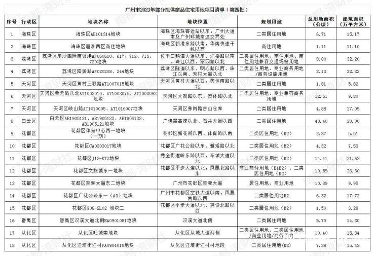 第四批18宗住宅地块,总用地面积150.94公顷,总建筑面积270.47万平方米。其中海珠区2宗、荔湾区2宗、天河区3宗、白云区1宗、花都区7宗、番禺区1宗、从化区2宗。