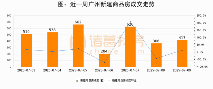 根据广州市住房和城乡建设局数据显示,2025年07月09日广州新建商品房成交417套,较昨日增加51套,环比上涨13.9%