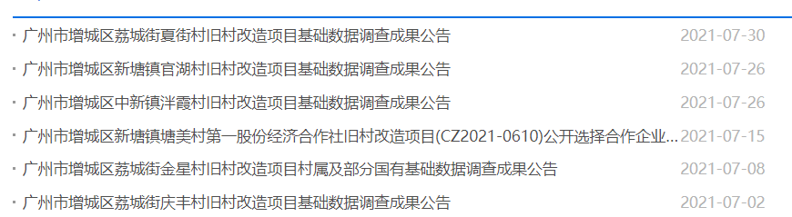 1村确定合作企业 5村公布旧改数据7月份以来,市规划和自然资源局增城区分局官网就公布了多个旧改村的基础数据调查成果,其中包括荔城街庆丰村、金星村、夏街村,新塘官湖村、中新泮霞村。另外,新塘塘美村排名前列股份经济合作社旧改项目也确定了(主)增城市顺欣房地产有限公司(成)广州市雄兴投资有限公司,广州市和盛商务有限公司(联合体)为项目的合作企业。
