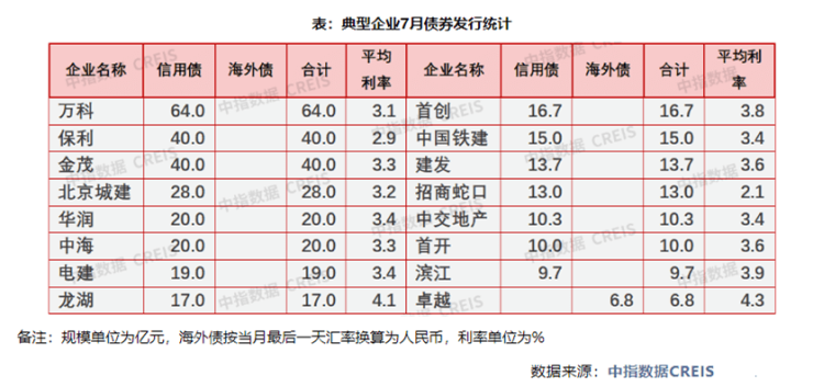 在融资成本方面,同策研究院高级分析师陈舒表示,7月融资成本范围在2%-7.13%;在已披露的数据中,融资成本较低的为招商蛇口发行的其他债权融资,融资金额约12.9亿元,票面利率约为2%;而融资成本高者为宝龙地产发行的公司债,融资金额约17.72亿元,票面利率为7.13%。